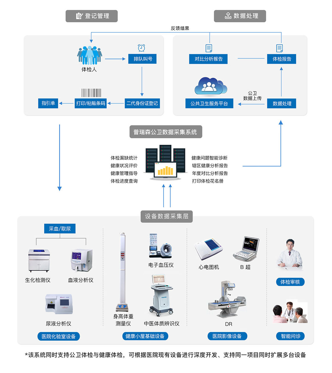 悟空体育公共卫生数据智能采集系统院内专业体检方案,是在基层医疗机构搭建一套适用于公卫体检、健康体检、健康教育、健康管理为一体的健康管理中心,深度集成公共卫生体检基础设备,无缝链接医疗机构现有的心电设备、超声检查设备、化验室设备,结合内科、外科、中医科等科室专业问诊,实现居民快速建档,体检数据自动采集,体检报告自助打印、体检数据自动上传至当地基本公共卫生服务平台的全功能应用。