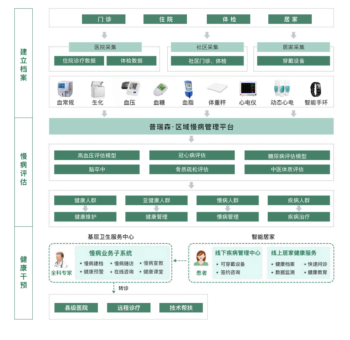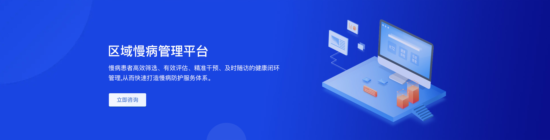 慢病管理整体解决方案通过建立一个覆盖医院、社区服务中心、乡镇卫生院以及村卫生室的区域慢病管理平台,通过整合门诊、住院、体检等健康数据和采集慢病健康自助一体机、健康随访包等设备健康信息,打造区域慢病大数据中心,为当地慢病高危患者进行高效筛选、有效评估、精准干预、及时随访等一体化的健康管理闭环服务,从而快速打造慢病防治干预的三级(二级医院、乡镇卫生院/社区卫生院、村卫生室)服务体系,有效提高慢病管理的效率。