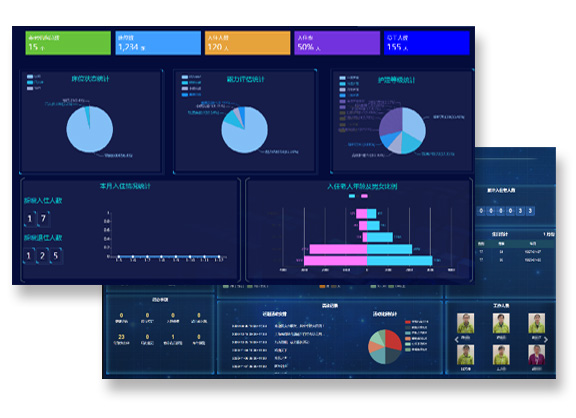 通过中央监控大屏实现对多种养老数据的动态地综合的展示,实时上传最新数据,使用系统可降低运营成本,实现统一管理,提升护理水平,降低对护理人员数量和专业程度的要求,提高养老院的管理服务的水平,为养老院创造良好的社会效益和经济效益,进而促进养老院的发展。