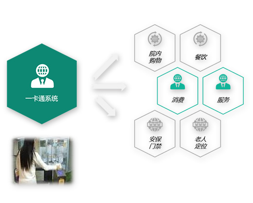 能在解决养老机构的管理的繁琐及复杂,将安保门禁、老人定位、购物、餐饮、服务、消费集合于一体,实现一卡通的管理模式,一张老人卡记录老人的行动轨迹及所有的消费明细
